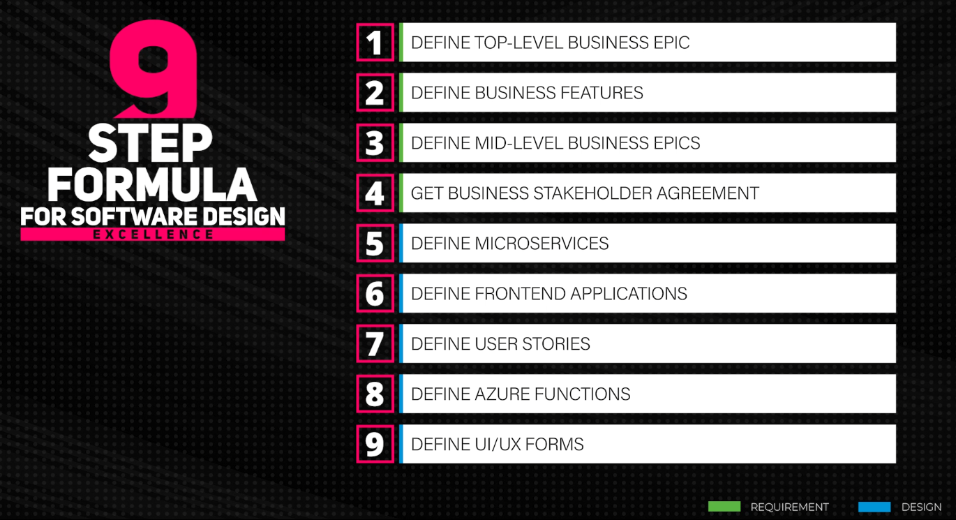 The formula steps for external software design. Includes microservices, UI applications, UI forms, Azure Function Apps and Azure Functions.