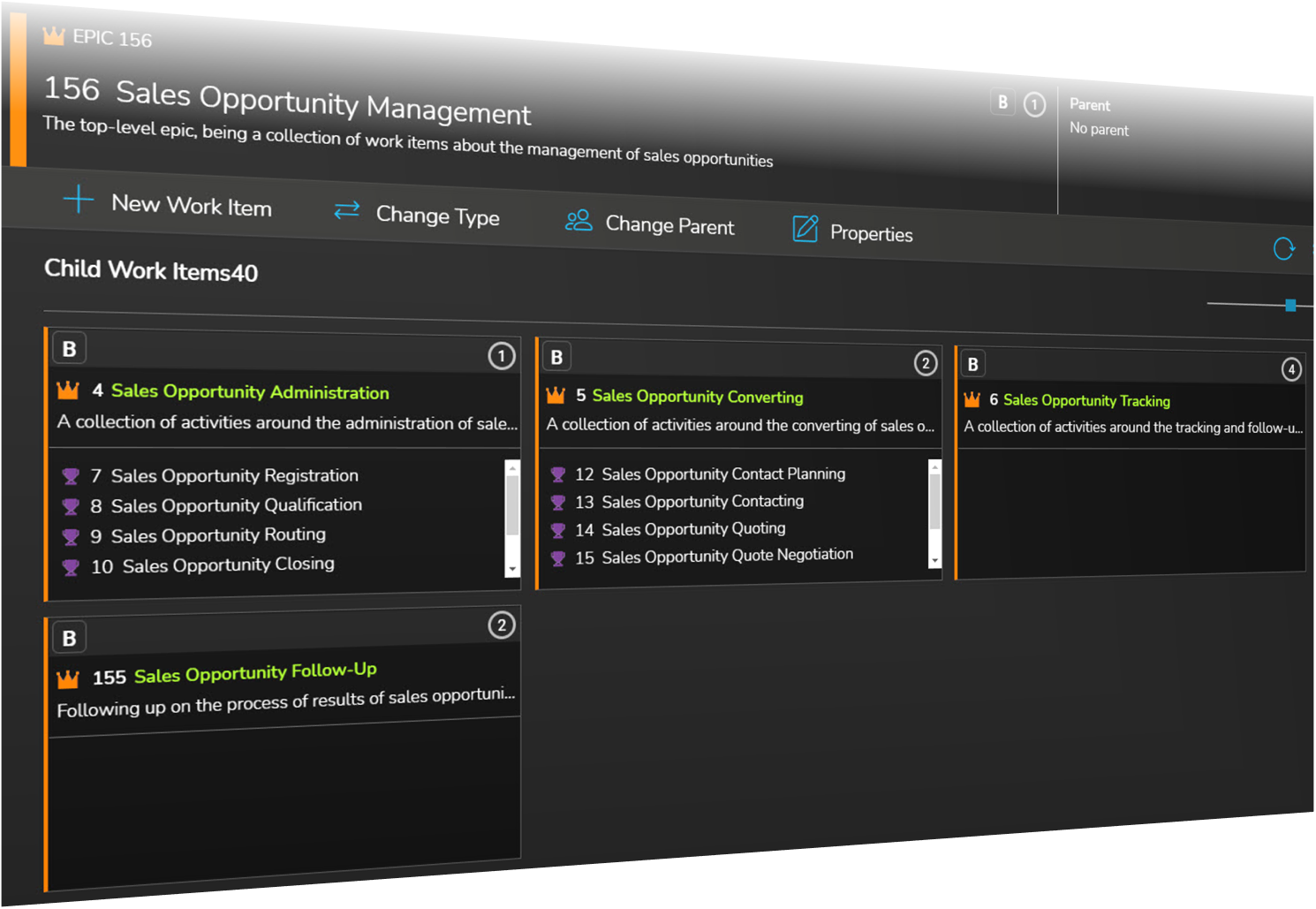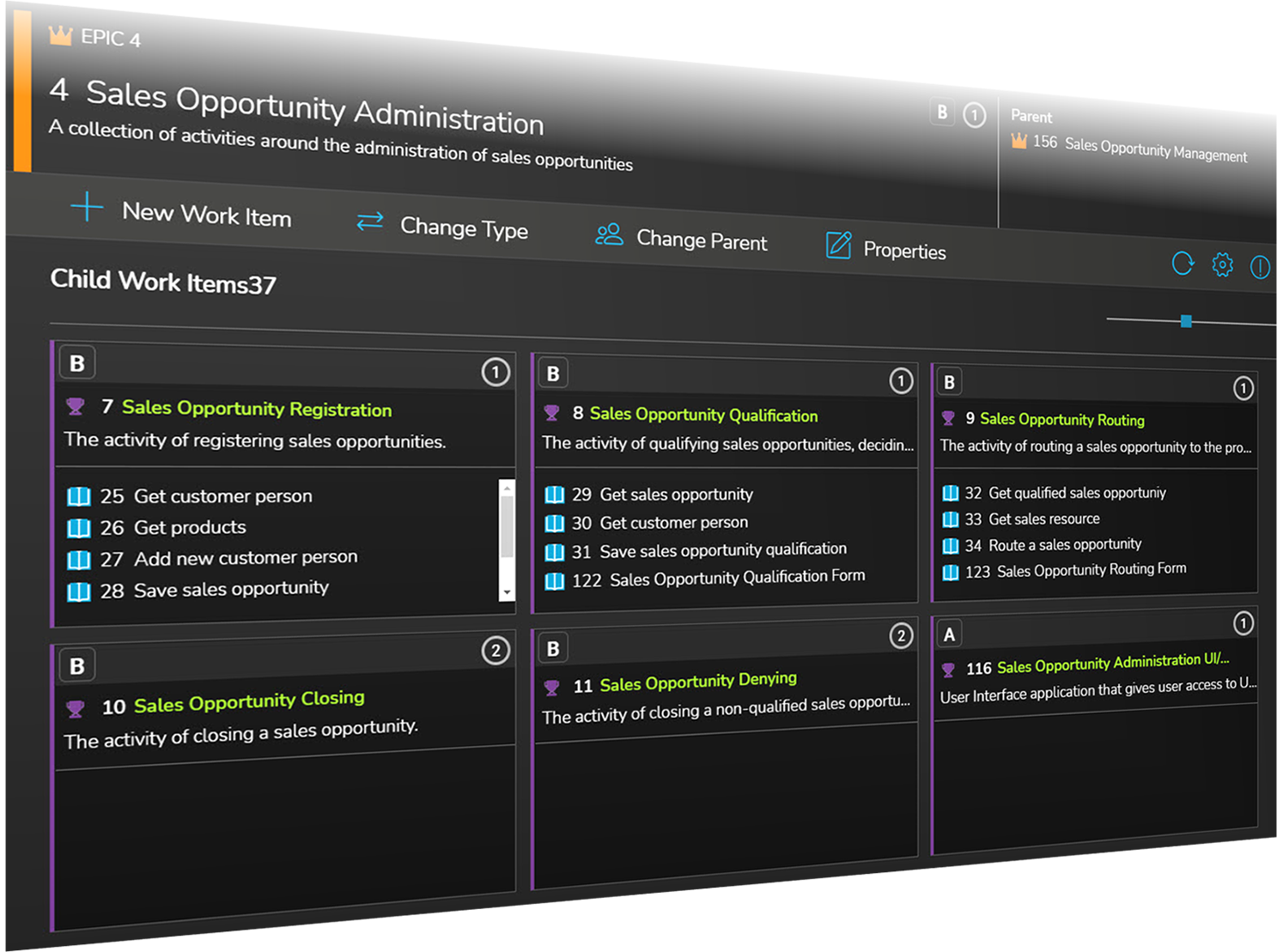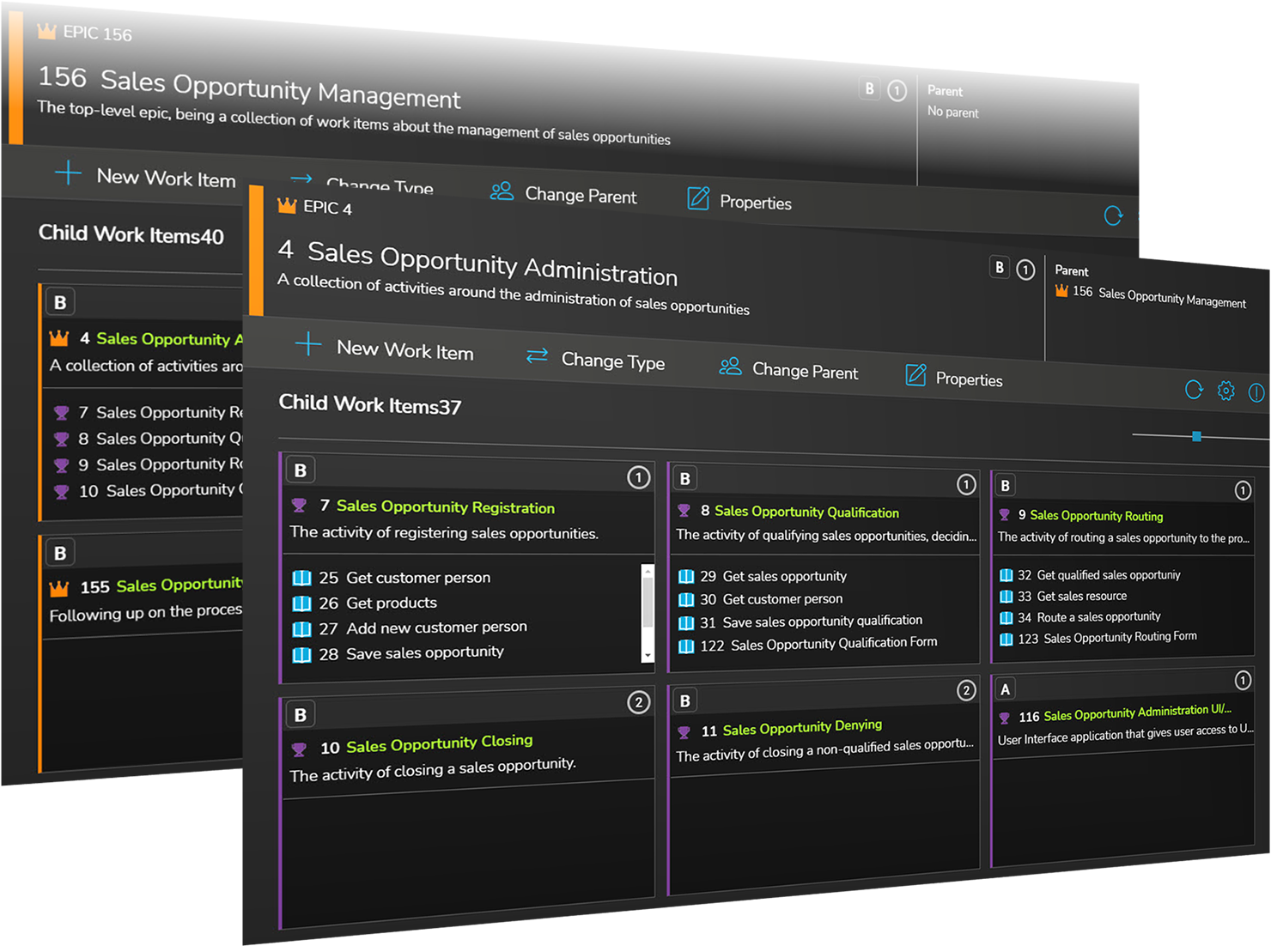 I Azure DevOps föra in resultaten av dessa aktiviteter. Att med Backlog Enhancers verksamhetsorienterade vyer redovisa den design du och ditt team successivt bygger upp och gör klar för implementering.